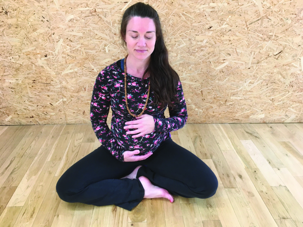 With your hands resting in your lap or on your belly, close your eyes or soften your gaze. Turn your attention to your breath, notice the rise and fall of the body, then begin to count the breaths, one on the inhale, two on the exhale, all the way up to 10 and then begin again at one. Giving the mind something to focus on as we breathe will prepare us for coping with contractions in the first stage of labour. Staying with our breath through these contractions will help us to maintain a calm mind and body through the intensity allowing the process to unfold as nature intended.