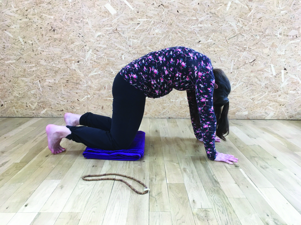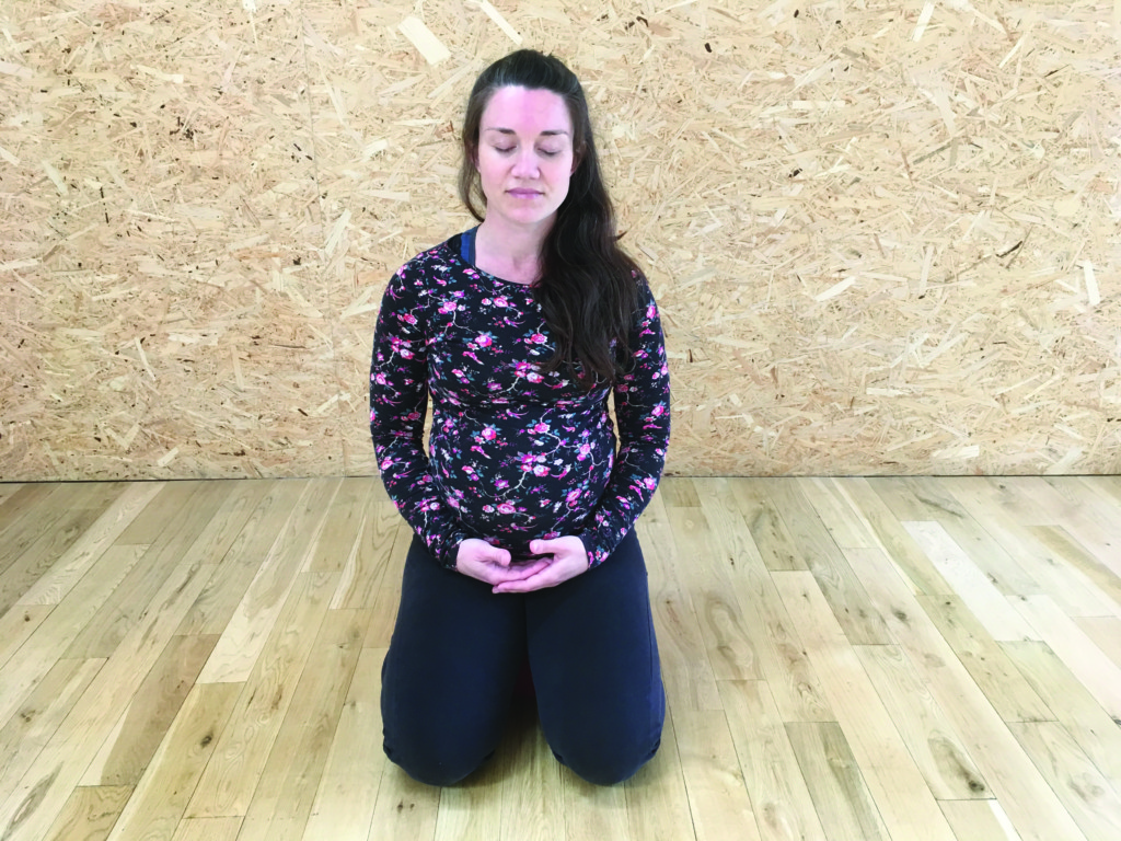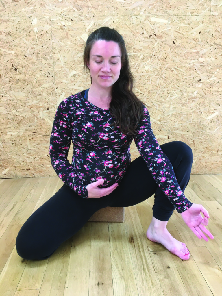 Maintain an upright spine and ensure that your knees are lower than your hips, sitting up on rm cushions, blocks or a bolster. As your belly grows sit higher, creating more space between thighs and bump. Take a moment to place your hands on your belly and breathe with your baby. Set an intention to cultivate acceptance with each breath.