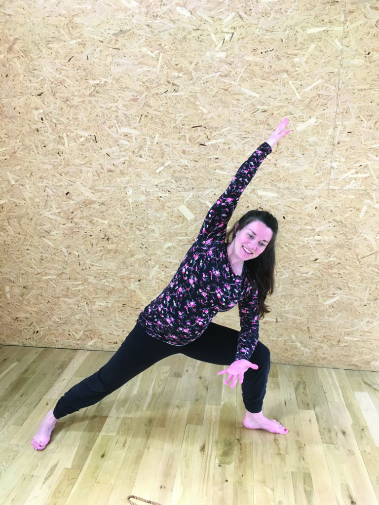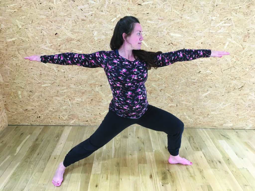 From a High Lunge keeping the front shin steady with the knee over the ankle, turn down the back heel and extend the arms from the bottom of the heart reaching into the fingertips. An alternative option would be to start from Tadasana and step back with the right leg. Remember that the joints are already quite loose in pregnancy so take a shorter than normal stance.