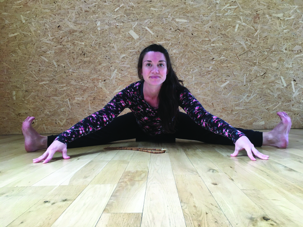Widen your legs without locking the knees. Feet are active, toes spread and pointing to the sky. Sit up on a block or bolster to avoid rounding in the lumbar spine. Stay humble with your forward fold, you may just want to stay upright and breathe into the crown of your head. What is nourishing will be the lengthening of the spine and connecting to your breath. If you can maintain the length in the spine walk the hands forward. A chair, stool or bolster placed between the legs can also be used to lean on for support. Rise up on an inhale supporting yourself.