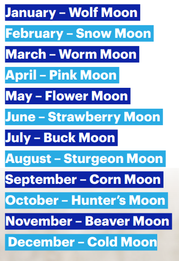 The Full Moon of each month has a specific name. Mostly it has to do with the season or the weather. Many of these names originate from different Native American tribes. Below are the English interpretations of the 12 most common Full Moons.