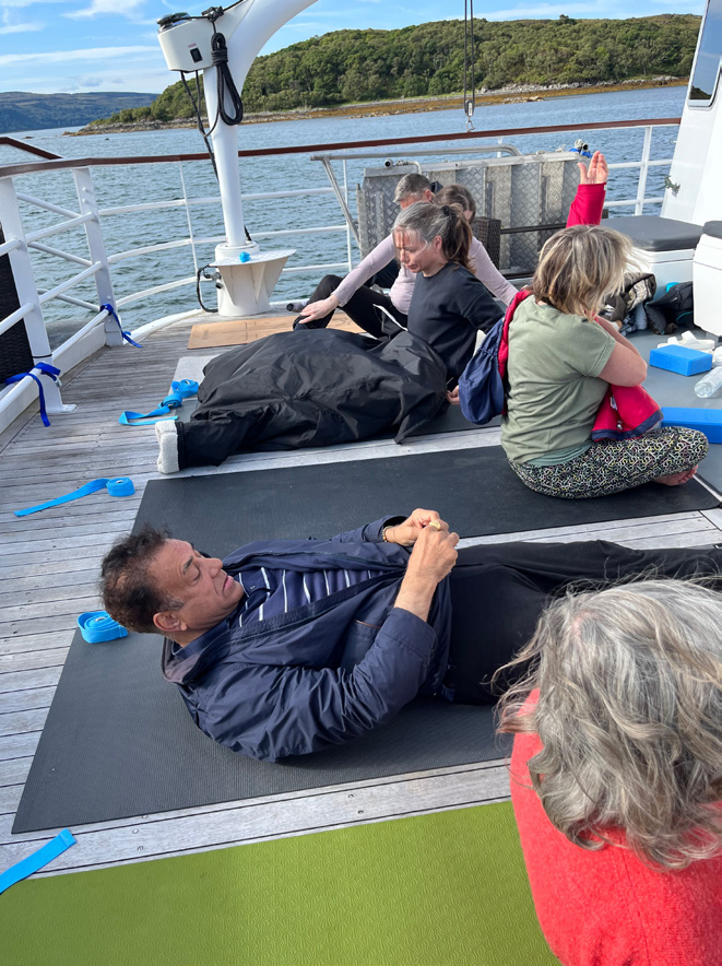 What renders this retreat truly exceptional is the harmonious amalgamation of yoga, wildlife encounters, and cruising through awe-inspiring landscapes. Guided by yoga practitioners, Laura Bicker and Iain Bruce-Low, the yoga sessions seamlessly unfolded both on board and ashore. The retreat commenced with a heartwarming guided meditation and an opening ceremony on the eve of August 26th. At 7 am the following day, we collectively ascended to the upper deck of Hebrides Cruises’ vessel, Emma Jane, to practice yoga postures and meditation, an experience that set the tone for the entire journey.