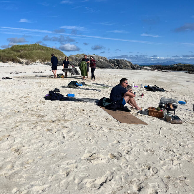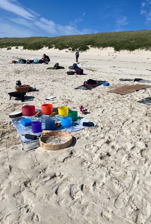 The instructors immersed us in an array of practices, from forest yoga on the pristine white sands of Gunna to turquoise waters of Cairns of Coll and the majestic hills and Fingal’s cave of Staffa. Under their nurturing guidance, we delved into forest yoga, ceremonies featuring heartfelt singing, fire ceremonies, and an array of therapies including meditation, reiki, sound baths, and even acupuncture.