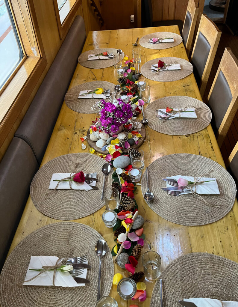 Stewardess Sophia added an extra layer of charm to our journey. Always sporting a warm smile, she demonstrated unwavering dedication, creativity, and meticulous attention to detail. Her flair for decor was evident in her exquisite table settings, adorned with rocks, feathers, shells, candles, and meticulously folded mats and napkins. To our delight, our cabins were magically tidied and adorned with a nightly chocolate on our pillows.
