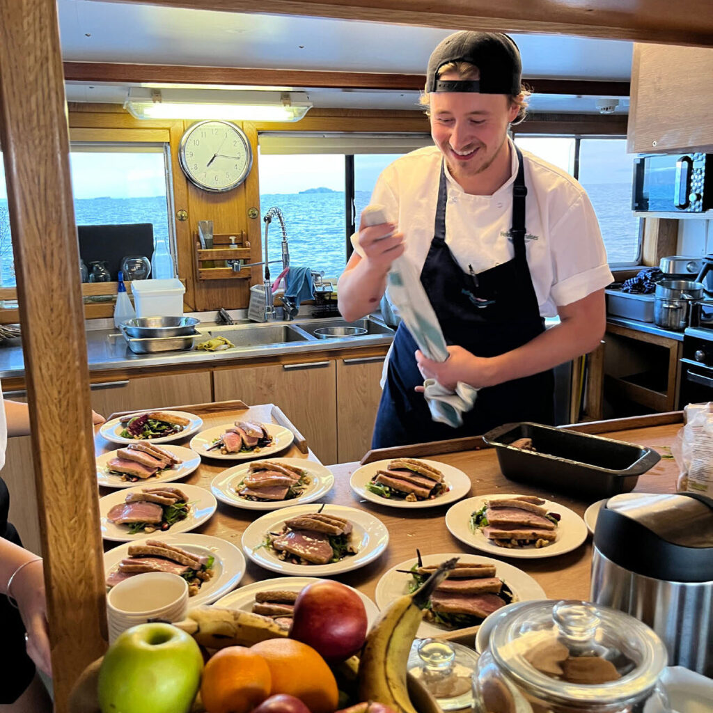 Dining aboard Hebrides Cruises’ vessel, Emma Jane, was nothing short of extraordinary, courtesy of renowned chef William Rocks from the esteemed Tigh an Truish Inn and Restaurant on Seil Island. William, a quarter-finalist in the recent Master Chef Professional series, delighted us with exquisite and healthful three-course creations. His culinary prowess was matched only by his warm and engaging personality as he described each course with evident pride. Even after dinner, we were treated to an array of local cheeses, biscuits, and beverages.