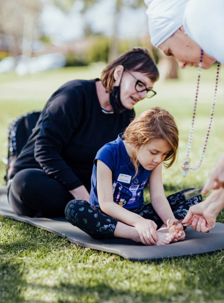 The self-regulated movement of yoga, where each individual chooses how much or how little they engage in the postures, allows individuals to participate to tolerance. Allowing for personal choices fosters a feeling of success. Physical adjustments are best kept to a bare minimum, and only with permission. Be aware that traditional yoga props such as straps and blocks may be turned into weapons. However, supervised non-traditional props may add stimulation for the senses, and fun. For example, placing weighted bean bags on the belly, or blowing bubbles, feathers, or leaves and watching the movement are activities helpful in connecting with the breath. This type of exercise, with fun props, assists in identifying between the inhale and exhale. Although, the words breathe in and breathe out are more easily understood by children. Taking a deep breath in through the nose and out through the mouth at the end of each posture facilitates a smooth transition to the next exercise. At the beginning of each class or personal practice, I suggest pausing, with intention and reverence, to connect with the Divine flow of life. In Kundalini yoga this is done by chanting the mantra Ong Namo, Guru Dev Namo three times. In Hatha traditions it may be chanting Om three times, or simply taking three deep breaths to prepare for yoga.