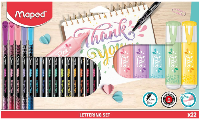 Unlock your inner artist with Maped’s 22-Piece Lettering Set, a colourful toolkit perfect for beginners and seasoned journalers alike. Featuring 16 Graph’Peps Deco fine-tipped pens and 6 pastel Flex highlighters, this kit blends precision and style. The 0.4mm felt-tips glide effortlessly across the page, ideal for outlining and detailed lettering, while the soft, flexible highlighters let you vary line thickness from 1 to 5mm with ease. Whether you’re exploring calligraphy, journalling, or adding flair to schoolwork, the pastel palette and ergonomic design make it a joy to use. Designed with creativity and comfort in mind, it’s a brilliant introduction to modern hand lettering. Bonus points for the soft grips and durable build that make long sessions more enjoyable. A must-have for any creative kit.