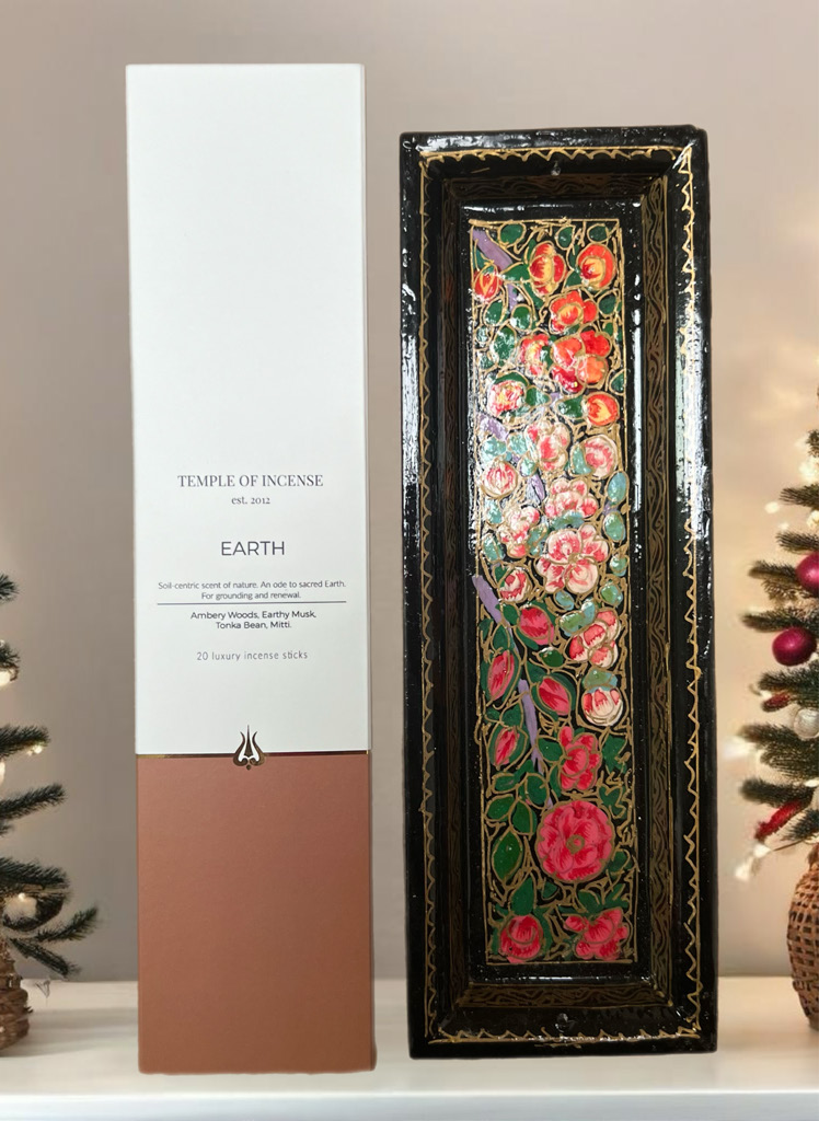Bring peace and tranquillity to your space with the Earth Gift Set by Temple of Incense. Ideal for yogis or anyone craving grounding and renewal, this set features Earth incense sticks made with a rich blend of amber woods, earthy musk, tonka bean, and mitti. Designed to help you feel connected and centred, it’s a perfect addition to your meditation or yoga practice. The set also includes a hand-painted Heer Kashmiri incense holder, which can double as an elegant trinket tray when not in use. Lovingly hand-wrapped and beautifully presented, the Earth Gift Set is ready to delight as a gift or as a treat for yourself. Its harmonious fragrance offers a gateway to calm amidst life’s chaos.