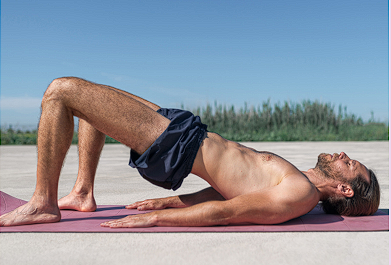 Exhale to tilt the pelvis towards you – imprinting your lower back on the mat– and roll the pelvis and spine up towards the ceiling one vertebra at a time.