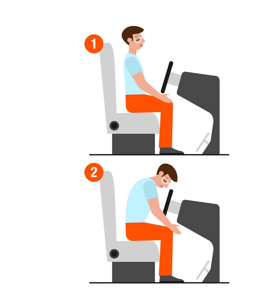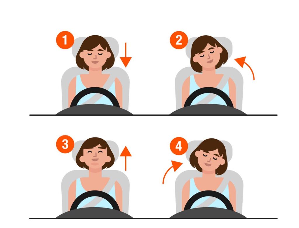Perfect for both the passenger and the driver, neck rolls relieve tightness and soreness in the neck. Brace your core and pull your shoulders down and back. Tip your head gently to the right side, lowering your ear toward your right shoulder. Hold the stretch there. Roll your head gently forward, dropping your chin toward your chest. Hold. Then finish with the left side. Repeat an equal number on both sides.