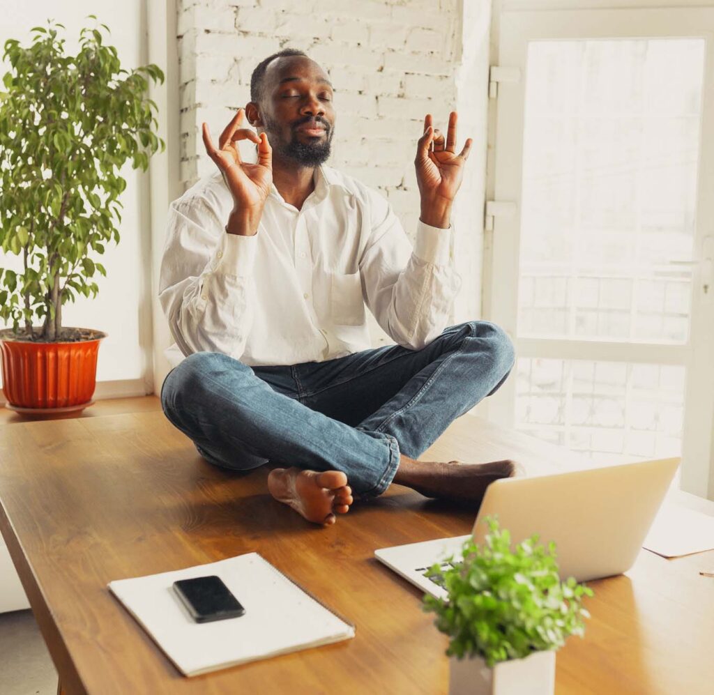 To begin with, sit comfortably or make yourself comfortable in bed if you are using this practice to induce sleep. Whether you are sitting on a chair or on the floor propped up with cushions – maybe with your back up against a wall – make sure you are comfortable and encourage your spine to be tall, shoulders back and down, and your chin parallel to the floor. If you are lying down, tuck the chin in ever so slightly to feel the length in the spine. Hands may either rest on your thighs, in your lap or wherever feels right for you. Take a few deep, easy breaths to settle the body down, lower the heart rate and quieten the mind. Now breathe in deeply, and as you do so, take the shoulders up towards the ears – as high as you can take them. And then as you breathe out, slowly roll the shoulders back and down as far away from the ears as you can. Repeat five times, working the movement of the shoulders with the breath, and then softly close your eyes. Take a quick body check to make sure that your body isn’t feeling any twinges or niggles anywhere and if so, adjust yourself so that your body is so comfortable and relaxed you have absolutely no desire to move, but know that if you need to move at any time it’s OK. The easiest way to bring our focus into the present moment is by being breath aware, so to begin with guide your awareness towards your breath and just listen and tune in to the gentle rhythm of your breathing. Continue to notice the breath gently coming and going – not analysing, altering or controlling the breath – just watching and being aware of the body slowly and gently breathing itself. The breath comes and goes naturally, steadily, easily and peacefully.