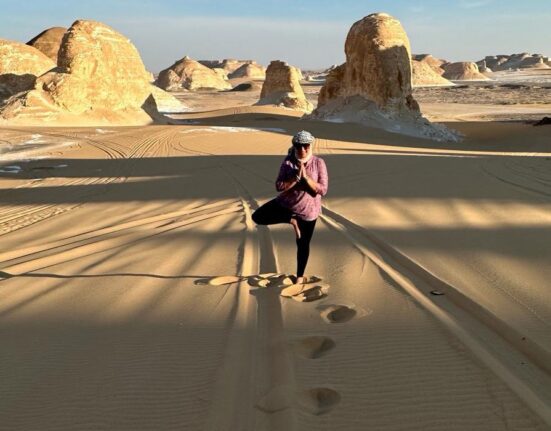 Words:Essraa Nawar As I strike the Tree pose before the ancient pyramids of Giza, captured in a moment of serene balance, I am.